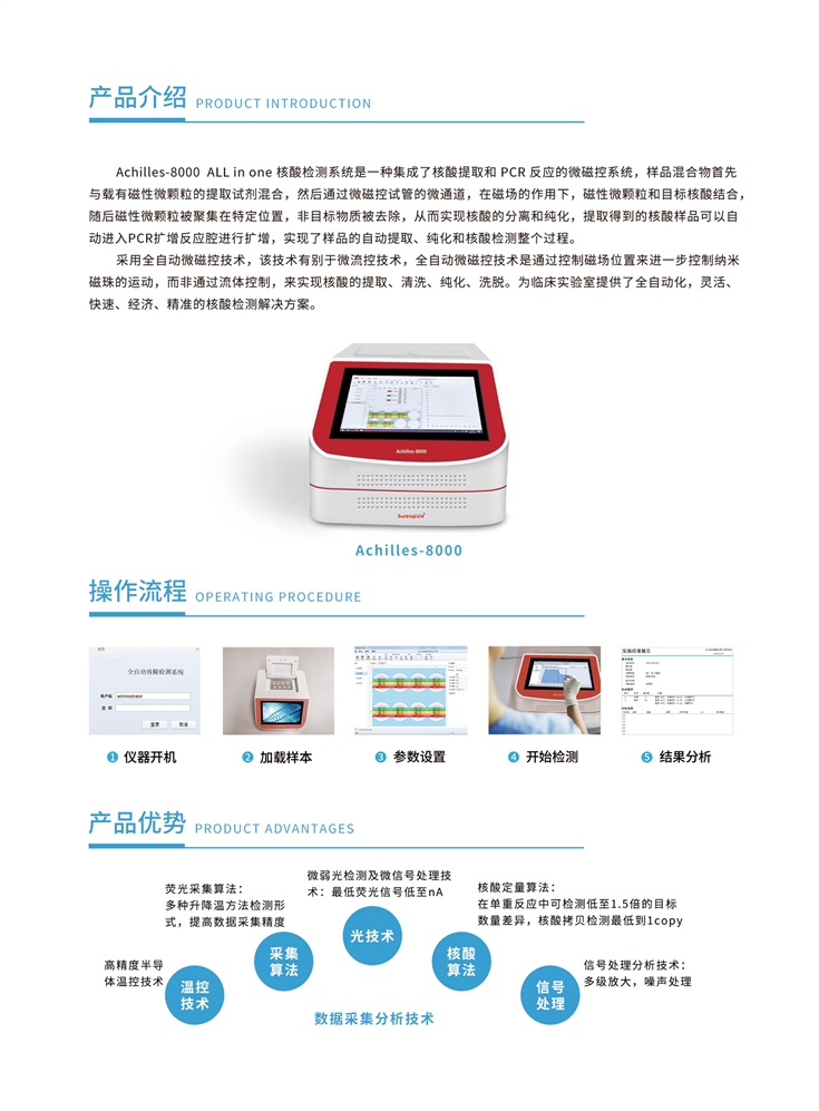 集成了核酸提取和PCR反應的微磁控系統(tǒng),樣品混合物首先與載有磁性微顆粒的提取試劑混合,通過微磁控試管的微通道,在磁場的作用下,磁性微顆粒和目標核酸結(jié)合,隨后磁性微顆粒被聚集在特定位置,非目標物質(zhì)被去除,從而實現(xiàn)核酸的分離和純化,提取得到的核酸樣品可以自動進入PCR擴增反應腔進行擴增,實現(xiàn)了樣品的自動提取、純化和核酸檢測整個過程。