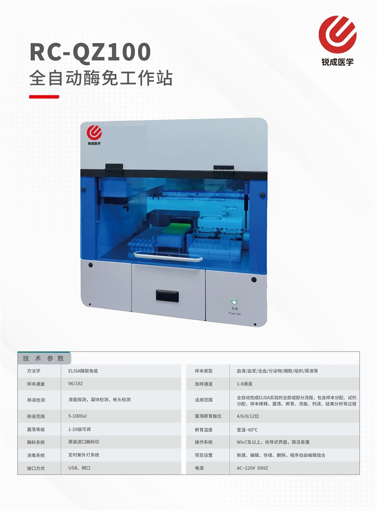 RC-QZ100全自動酶免工作站適用范圍:全自動完成ELISA實驗的全部或部分流程,包含樣本分配、試劑分配、樣本稀釋、震蕩、孵育、洗板、判讀、結果分析等過程