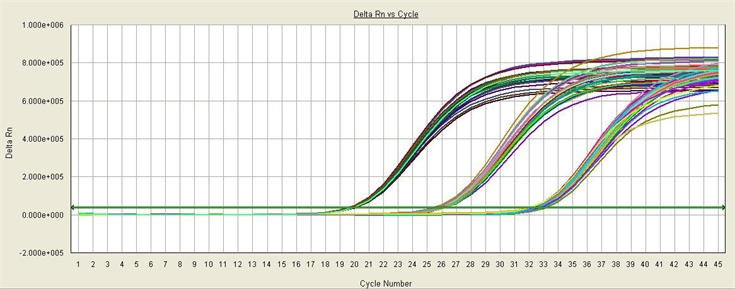 將培養的腸道病毒 EV71 型(RNA 病毒) 10 倍梯度稀釋得到高、中、低三個梯度,使用杭州 奧 盛 核 酸 提 取 儀 配 套 Surbiopure? Viral DNA/RNA kit 重復提取 20 次,使用中山大學達安基因股份有限公司“腸道病毒 EV71 型核酸檢測試劑盒(PCR-熒光法)”對得到的結果重復檢測。